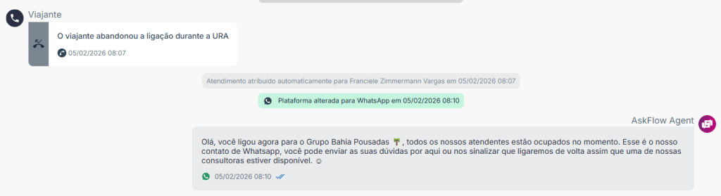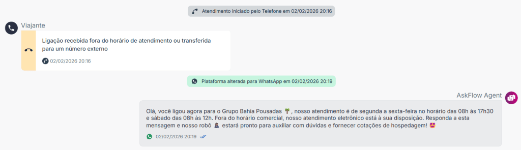 - Continuidade no atendimento: Garante que o viajante receba orientação imediata no WhatsApp, mesmo que a ligação tenha ocorrido fora do horário comercial.
